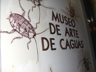 La intervención de cucarachas en papel pasquinadas sobre la fachada del Museo por José Ortíz nos gusta mucho, ya que el caparazón de las bestias es tatuado con motivos orgánicos que nos recuerdan a los encontrados en los cuerpos Taínos del muralista Rafael Rivera García.