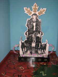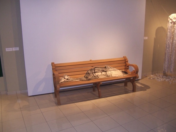 Entre nuestros favoritos se encuentra una escultura fina hecha en cartón por Omar Velázquez, en la que un deambulante, en líneas y texturas gruesas, parece estar acostado de espaldas al espectador en un banco genérico de esos que vemos en cualquier parque o plaza. Los pasamanos decorativos, así como el banco entero, están hechos a mano y el deambulante es un grabado en papel pegado a la superficie. Velázquez se ha venido destacando por su eficaz factura en terminaciones de calidad, la facilidad con que se desenvuelve en gran formato y su tajante crítica social y cultural. Un buen ejemplo lo vimos hace poco en su instalación de un Albizu con perros, Moriviví, en el Museo Pío López Martínez (Casa Frade) del recinto de la UPR en Cayey. A pesar de lo buena que es la obra del deambulante la misma no es característica de su estilo ya que parece una pieza que forma parte de una instalación mucho más grande y complicada.