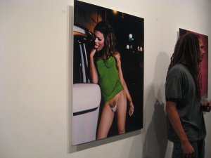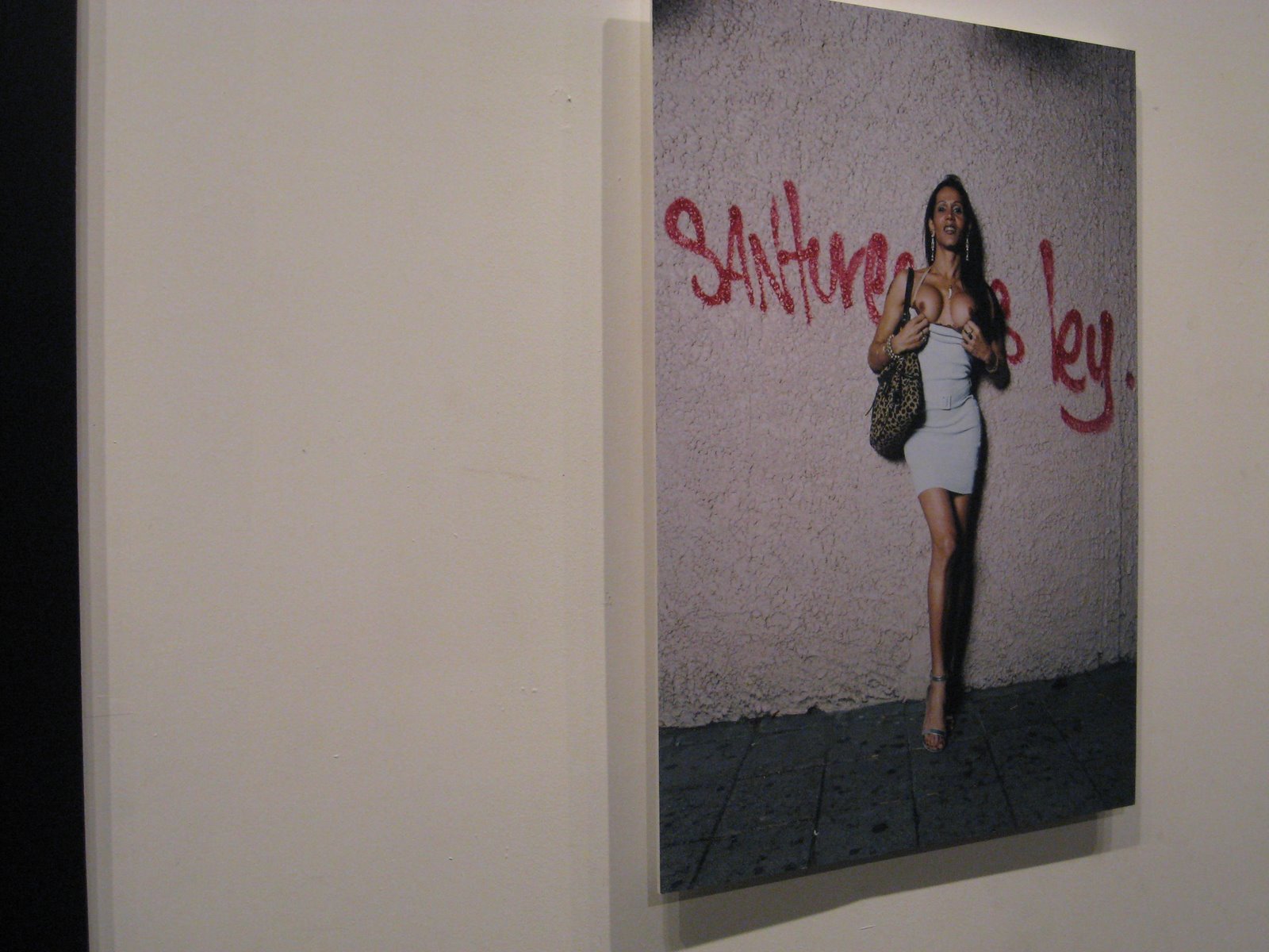 Tristán Reyes continua su desarrollo desenfrenado como uno de nuestros mejores artistas. Esta vez presenta dos fotografías de gran formato de su serie Santurce es Ley, título tomado de un tag en un callejón frecuentado por prostitutas, hustlers, travestis, transexuales y demás supuesta escoria de la sociedad. Digo supuesta porque Reyes ha logrado una fotografía íntima a través de vistas casuales nocturnas y retratos posados con una factura “haute couture”. Reyes no es el primero que trabaja el tema, hace poco Luis Alcalá del Olmo presentó retratos de transexuales de Brasil, en blanco y negro de textura granosa, en la Galería Botello, la cual era dirigida a la mirada masculina en un especie de juego de percepción, seducción y de sorpresa. Reyes, en cambio, retrata individuos que toman posesión de su territorio con seguridad y orgullo.